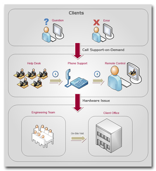 A truly revolutionary way to help troubleshoot issues, Support-on-Demand essentially puts a skilled technician in your computer. We apply a 2-tier approach: